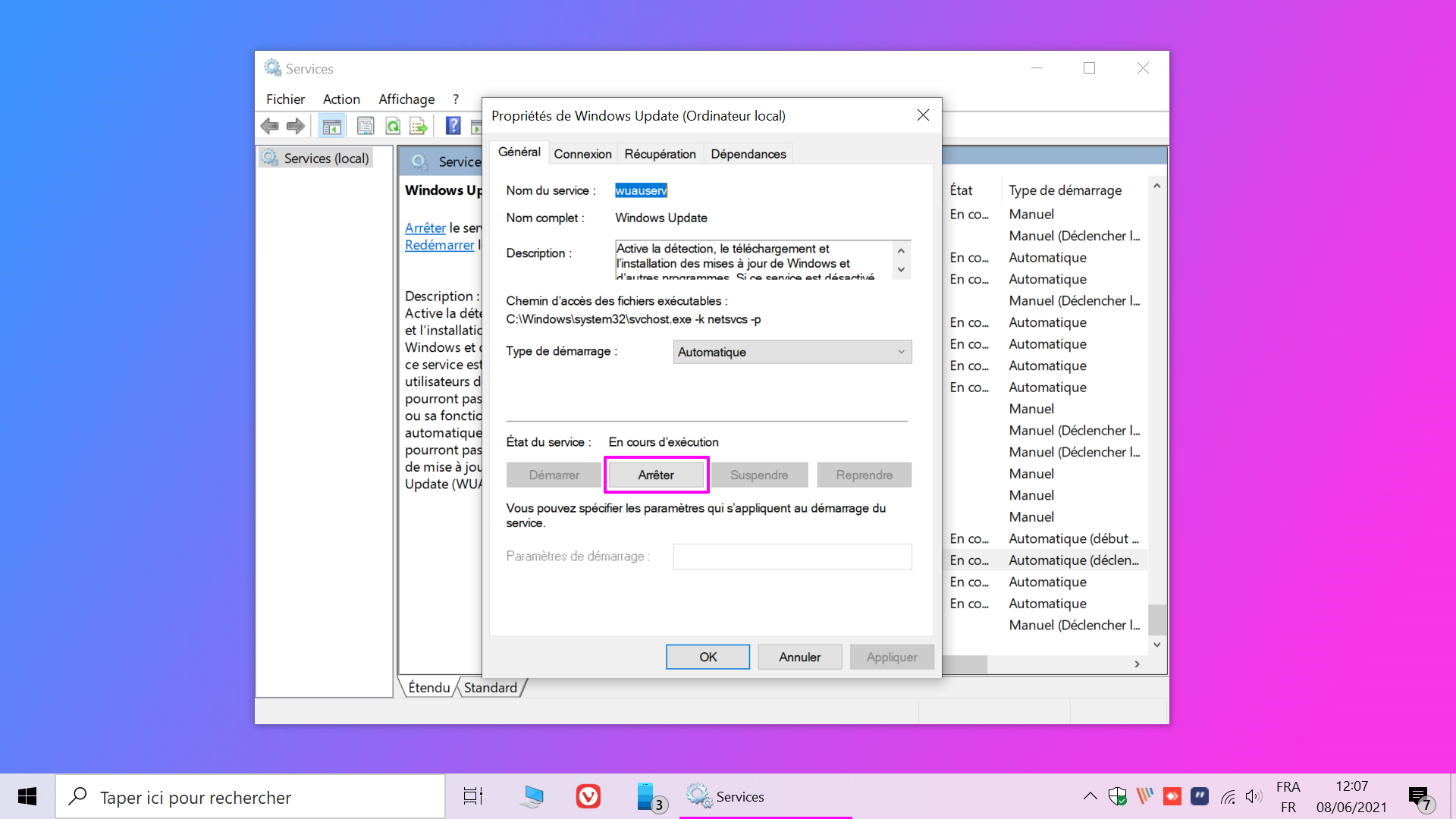 Double-cliquez sur "Windows Update" pour pouvoir modifier ses propriétés. Cliquez sur "Arrêter"